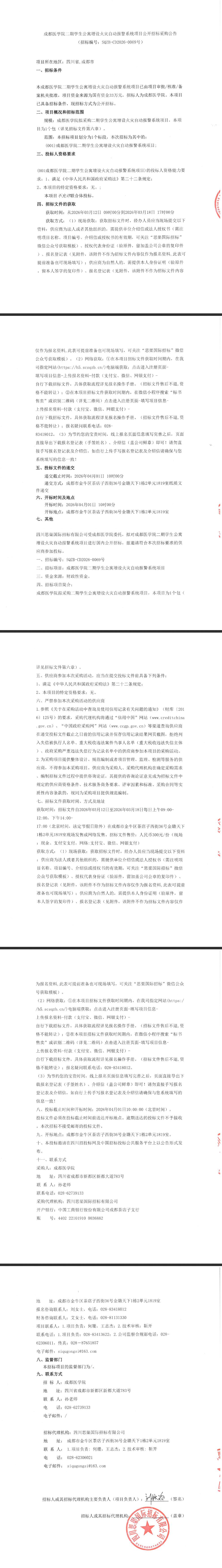 成都医学院二期学生公寓增设火灾自动报警系统项目公开招标采购公告