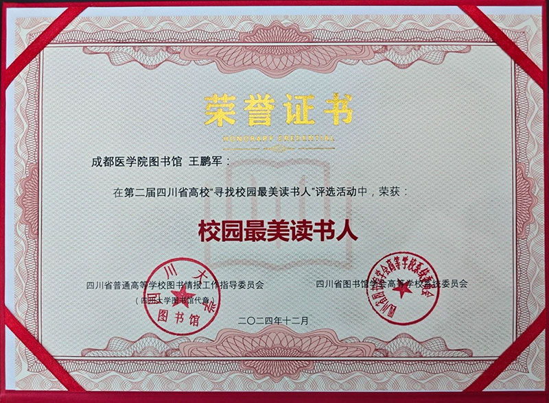 近日,由四川省普通高等学校图书情报工作指导委员会、省图书馆学会高等学校系统委员会举办的第二届四川省高校“校园最美读书人”评选活动落幕。学校图书馆推荐的王鹏军老师从全省49所高校近千名参评师生中脱颖而出,成功入选,成为30位获奖者之一。