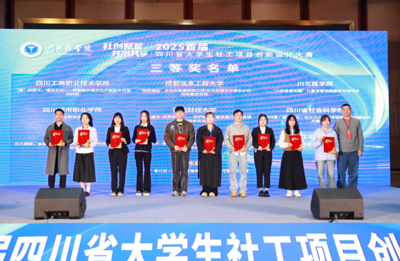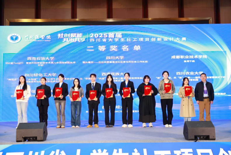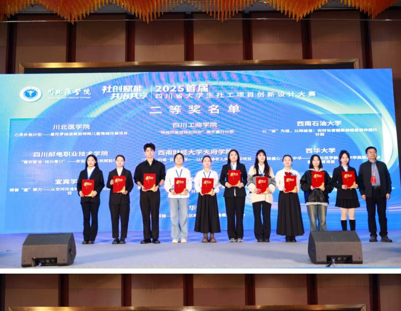 11月10日,在“社创赋能・共治共享”2025四川省首届大学生社工项目创新设计大赛决赛中,附一院指导的三支学生团队全部获奖、载誉而归。独立指导的项目《“石榴花开・医社护心”民族地区医务社工多发性心脏病全流程服务体系建设》获三等奖,是学校唯一一个入围决赛的项目;与西南石油大学共同指导的《Wei爱Tong行:胃肠外科学龄期手术患儿全流程赋能支持计划》《以“茶”为媒,以阵破局:农村长者糖尿病健康素养提升计划》分别荣获二等奖。