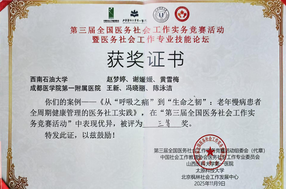 11月8日至9日,在第三届全国医务社会工作实务竞赛暨实务论坛上,附一院报送的《从“呼吸之痛”到“生命之韧”:老年慢病患者全周期健康管理的医务社工实践》案例,凭借“全程精准服务+人文关怀赋能”的创新模式、显著服务成效及深刻专业反思,从全国众多参赛作品中脱颖而出,荣获全国三等奖。该案例为提升医疗服务温度与效能提供了可复制的成功样本。