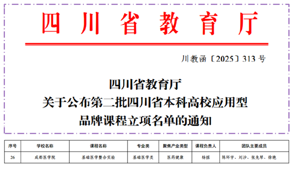 近日,四川省教育厅公布了第二批四川省本科高校应用型品牌课程立项名单,由我校基础医学院杨拯教授主持,陈环宇、张先琴、刘沙、徐艳、张晓等老师参与建设的《基础医学整合实验》课程凭借鲜明的特色、创新的教学模式以及良好的育人成效成功立项。