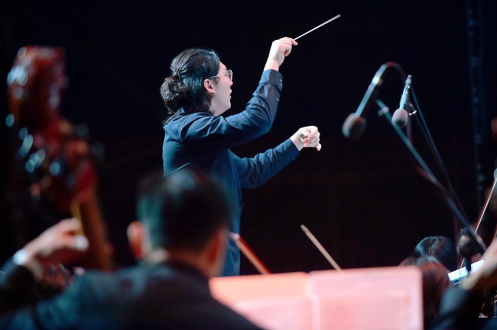 青年指挥家苑鑫的登场迎来热烈掌声,作为维瓦尔第国际音乐比赛指挥一等奖获得者,他以精准而富有张力的指挥,引领乐团开启三大音乐篇章。第一篇章“岁月如歌”以《红旗颂》宏伟开场,辅以《觉醒年代》《绒花》等作品,表现了中国人民英勇顽强的革命气概,讴歌了祖国蒸蒸日上的繁荣景象;第二篇章“古典之声”中,《蓝色多瑙河》的悠扬旋律与《威风堂堂进行曲》的雄浑节奏交相辉映,展现了古典艺术的永恒魅力;第三篇章“时代征程”以《在希望的田野上》铺展乡村振兴画卷,终曲《钢铁洪流进行曲》则以排山倒海之势,奏响民族复兴的铿锵足音,将整场音乐会推向最高潮。