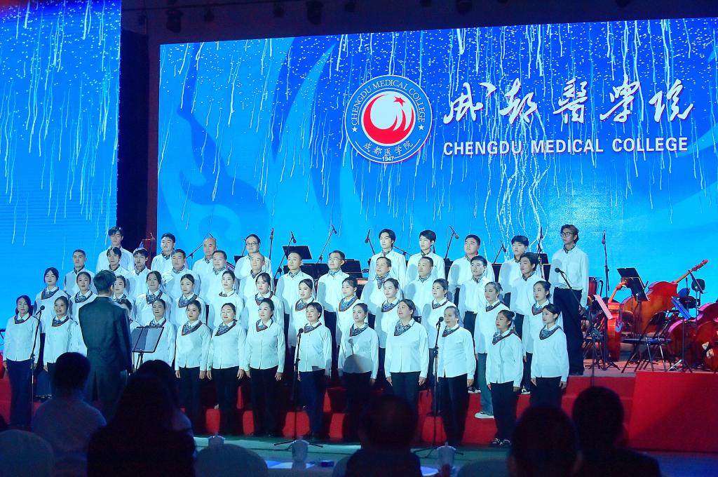 音乐会在庄严的钟声中拉开帷幕。成都医学院师生合唱团率先登台,由学校老教授、青年教师与2025级新生共同演绎《在太行山上》和校歌《我们是守护生命的人》,铿锵的节奏与深情的和声,彰显了学校红色底蕴和“根于军魂,本于医道,突出应用,追求精淳”的育人特色,引发全场共鸣。