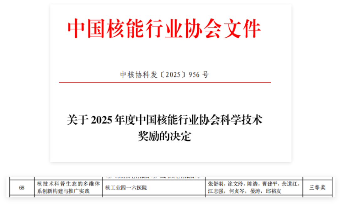 近日,2025年度中国核能行业协会科学技术奖揭晓,由附二院张舒羽教授牵头,涂文玲副教授、余道江教授、江志强书记等核心成员参与,联合四川省原子能院、苏州大学、四川大学等单位共同完成的“核技术科普生态的多维体系创新构建与推广实践”项目,荣获科技进步奖三等奖。