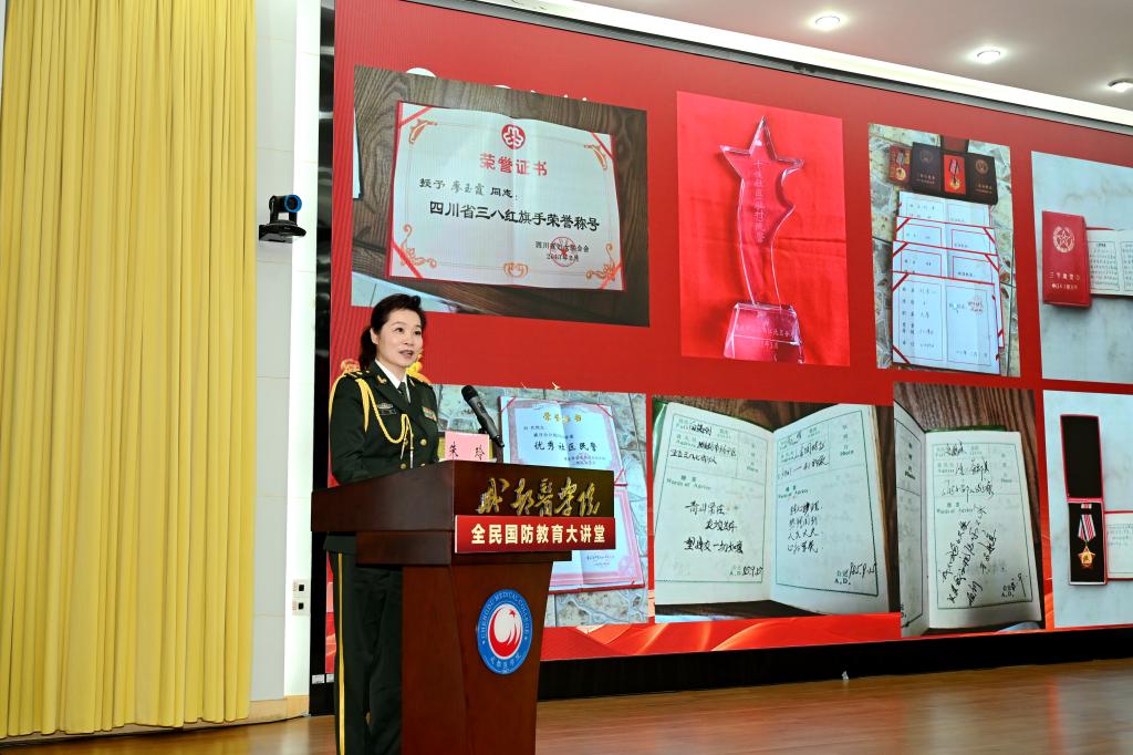 “南疆英雄八姐妹”的代表朱玲校友重返母校,为成医学子送上成长寄语。回溯1985年8月,成都医学院前身成都军区军医学校的八名女学员主动请缨,奔赴老山前线。在战场上,她们以英勇无畏的精神和精湛的护理技术,赢得前线指战员的高度赞誉,荣立部队集体三等功。朱玲结合自身战地经历,讲述了那段烽火岁月中的坚守与担当,勉励成医学子秉承“政治坚定、技术优良、艰苦奋斗、救死扶伤”的红医精神,将革命先辈熔铸的精神火炬稳稳接在手中。