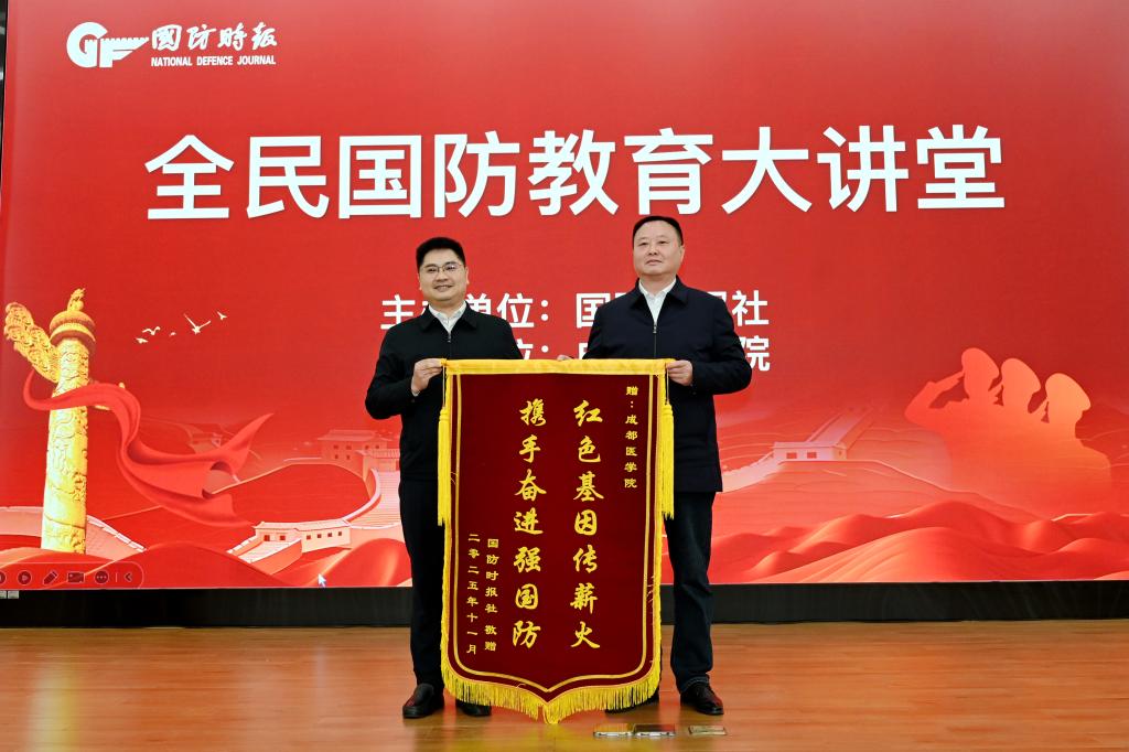 国防时报社、成都医学院为黄拥军、朱玲两位嘉宾颁发聘书,报社向学校赠送“红色基因传薪火携手奋进强国防”锦旗。双方表示,将持续深化校媒合作,推动国防教育融入人才培养全过程。