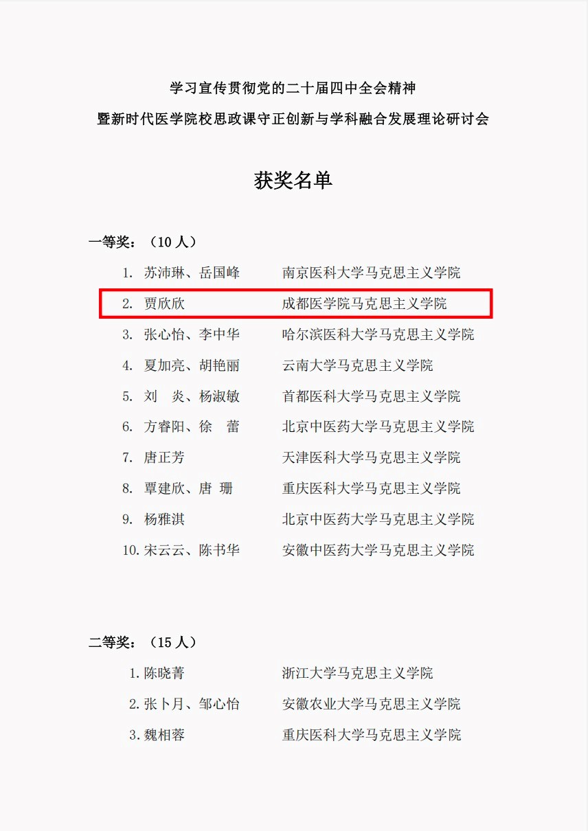 近日,在全国独立设置医学院校马克思主义学院联盟与皖南医学院共同主办的学习宣传贯彻党的二十届四中全会精神暨新时代医学院校思政课守正创新与学科融合发展理论研讨会上,我校2023级马克思主义理论专业硕士研究生贾欣欣同学撰写的论文《基于差异化视角的中医药文化融入医学院校思想政治教育的实证研究》荣获一等奖,并受邀在分论坛作视频主题发言。