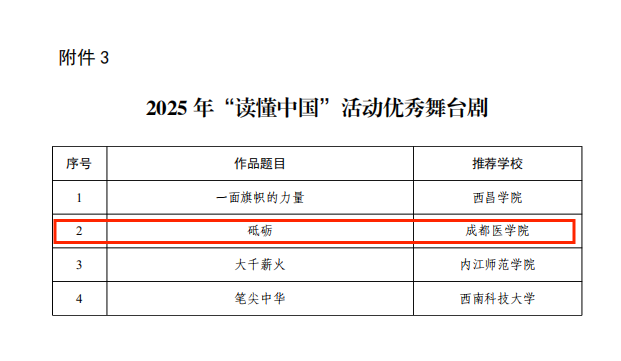近日,四川省教育厅关心下一代工作委员会正式公布了2025年“读懂中国”活动评选结果。我校关工委报送的征文《一支钢笔的自白》和舞台剧《砥砺》分别荣获优秀征文和优秀舞台剧奖。此前,征文《一支钢笔的自白》获教育部关工委优秀征文,四川省仅3篇入选。本次活动,全省共有48所高校参与,全省收集征文1747篇、微视频281个、舞台剧12部,其中34篇征文、4部优秀舞台剧脱颖而出,获优秀作品。