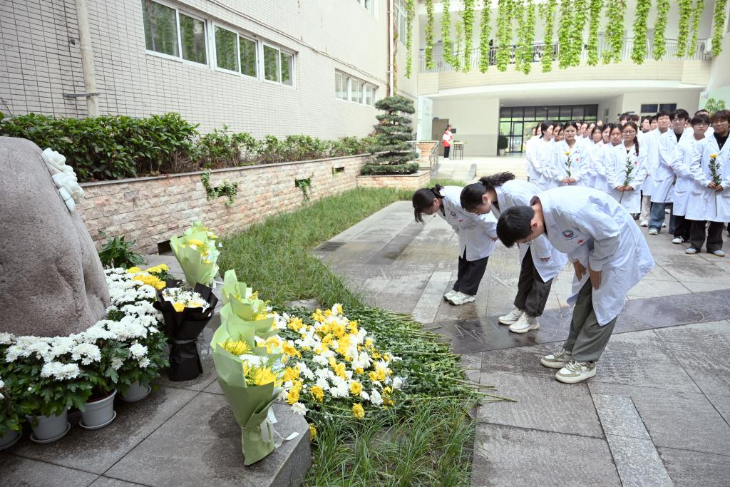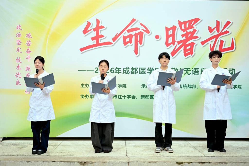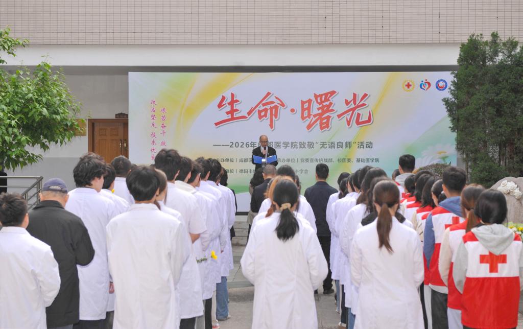 据了解,成都医学院每年清明节前夕,都开展致敬“无语良师”活动,以弘扬遗体捐献志愿者无私奉献、大爱无疆精神,厚植学生敬佑生命、甘于奉献、救死扶伤的精神理念,引导学生精益求精于医术,涵育博学仁爱的品德。2026年学校致敬“无语良师”活动的主题为“生命·曙光”,学校师生,遗体和人体器官捐献者家属,德阳市红十字会、新都区红十字会工作人员近百人参加,为医学生上好医学人文教育这堂思政大课,