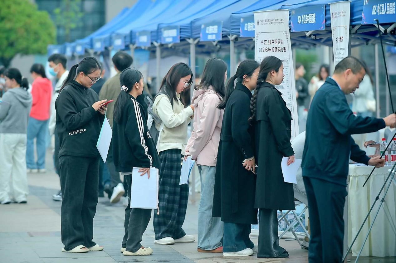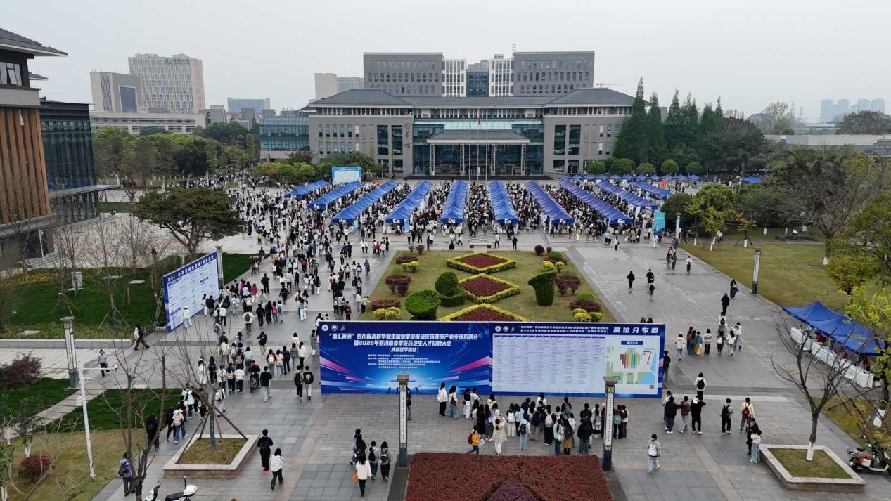为搭建毕业生与用人单位高效对接平台,促进毕业生高质量充分就业,4月3日学校举办“蜀汇菁英”四川省高校毕业生就业常设市场(医药健康产业类)专场招聘会暨2026年四川省春季医药卫生人才招聘大会(成都医学院站)。本次双选会吸引了280余家医疗卫生机构、医药企业及科研单位参会,提供就业岗位5000余个,涵盖我校毕业生所有学历层次及专业需求。据统计,本次双选会中,学生线上线下投递简历7000余份,初步达成就业意向600余人,现场签约人数240余人。