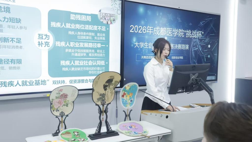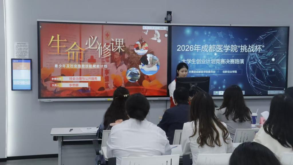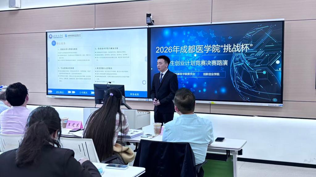 以创新之名,赴青春之约。4月9日下午,2026年成都医学院“挑战杯”大学生创业计划竞赛决赛路演在新都校区多功能厅举行。本次赛事由校团委与创新创业学院联合主办,经各二级学院广泛动员、层层选拔及专家评审,最终30支团队脱颖而出晋级决赛,齐聚现场共赴青春与创意的碰撞。