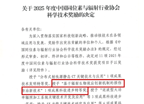 近日,第三届国际核技术应用产业发展大会在北京开幕,20多个国家的400余名嘉宾代表参会。会上举行了2025年度中国同位素与辐射行业协会科学技术奖颁奖典礼,由附二院牵头、联合多家单位完成的“基于辐射生物效应创新机制的损伤防治新技术”项目,荣获本年度唯一科技进步特等奖。该奖项的获得,标志着附二院在辐射生物效应与损伤防治领域的研究水平得到行业认可。