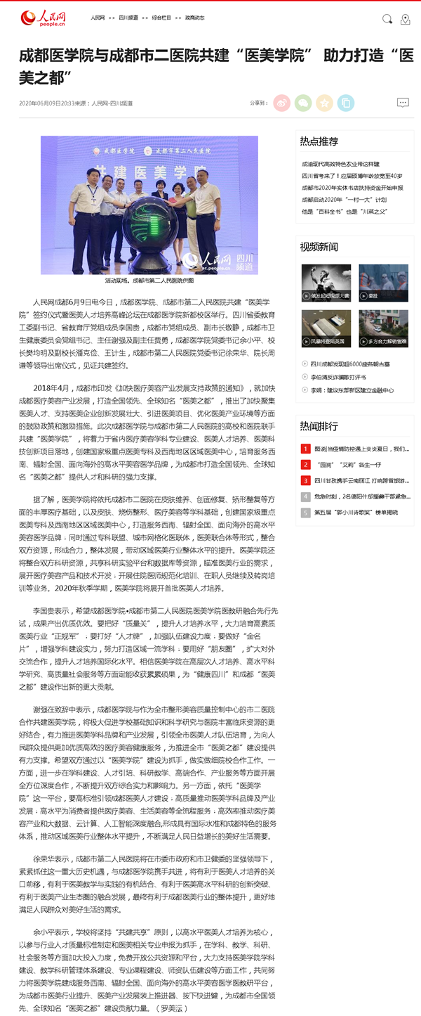 据了解,医美学院将依托成都市二医院在皮肤维养、创面修复、矫形整复等方面的丰厚医疗基础,以及皮肤、烧伤整形、医疗美容等学科基础,创建国家级重点医美专科及西南地区区域医美中心,打造服务西南、辐射全国、面向海外的高水平美容医学品牌﹔同时通过专科联盟、城市网格化医联体,医美联合体等形式,整合双方资源,形成合力,整体发展,带动区域医美行业整体水平的提升。医美学院还将整合双方科研资源,共享科研实验平台和数据库等资源,瞄准医美行业的需求,展开医疗美容产品和技术开发﹔开展住院医师规范化培训、在职人员继续及转岗培训等业务。2020年秋季学期,医美学院将展开首批医美人才培养。