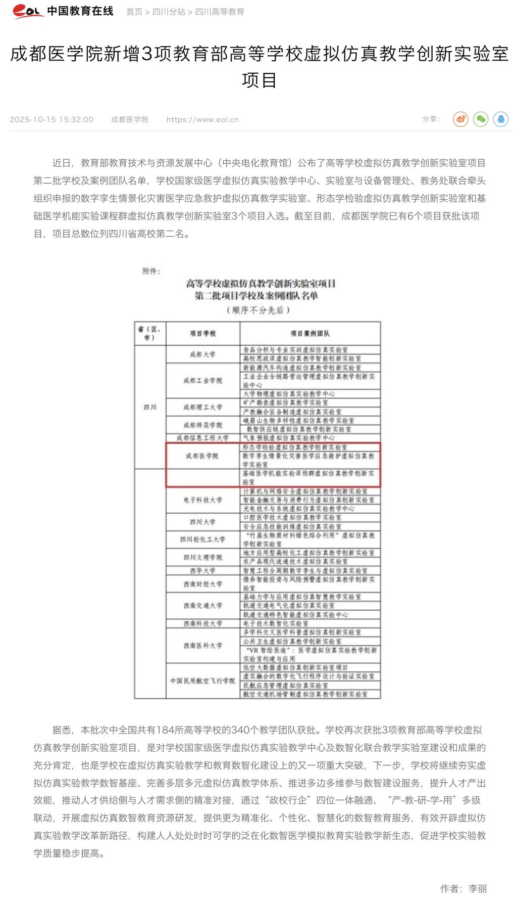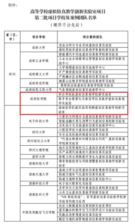 近日,教育部教育技术与资源发展中心(中央电化教育馆)公布了高等学校虚拟仿真教学创新实验室项目第二批学校及案例团队名单,学校国家级医学虚拟仿真实验教学中心、实验室与设备管理处、教务处联合牵头组织申报的数字孪生情景化灾害医学应急救护虚拟仿真教学实验室、形态学检验虚拟仿真教学创新实验室和基础医学机能实验课程群虚拟仿真教学创新实验室3个项目入选。截至目前,成都医学院已有6个项目获批该项目,项目总数位列四川省高校第二名。