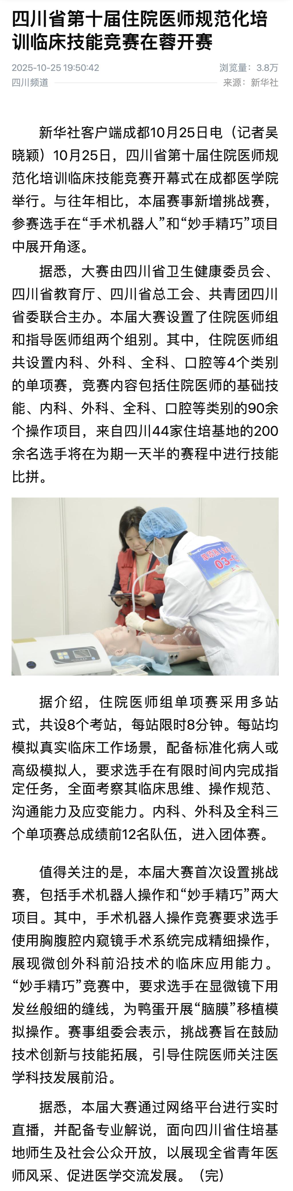 据悉,本届大赛通过网络平台进行实时直播,并配备专业解说,面向四川省住培基地师生及社会公众开放,以展现全省青年医师风采、促进医学交流发展。(完)