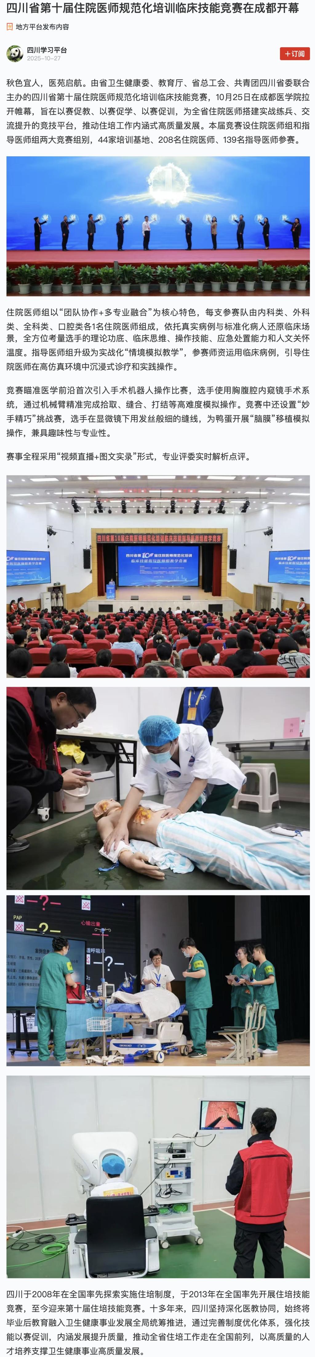 四川于2008年在全国率先探索实施住培制度,于2013年在全国率先开展住培技能竞赛,至今迎来第十届住培技能竞赛。十多年来,四川坚持深化医教协同,始终将毕业后教育融入卫生健康事业发展全局统筹推进,通过完善制度优化体系,强化技能以赛促训,内涵发展提升质量,推动全省住培工作走在全国前列,以高质量的人才培养支撑卫生健康事业高质量发展。