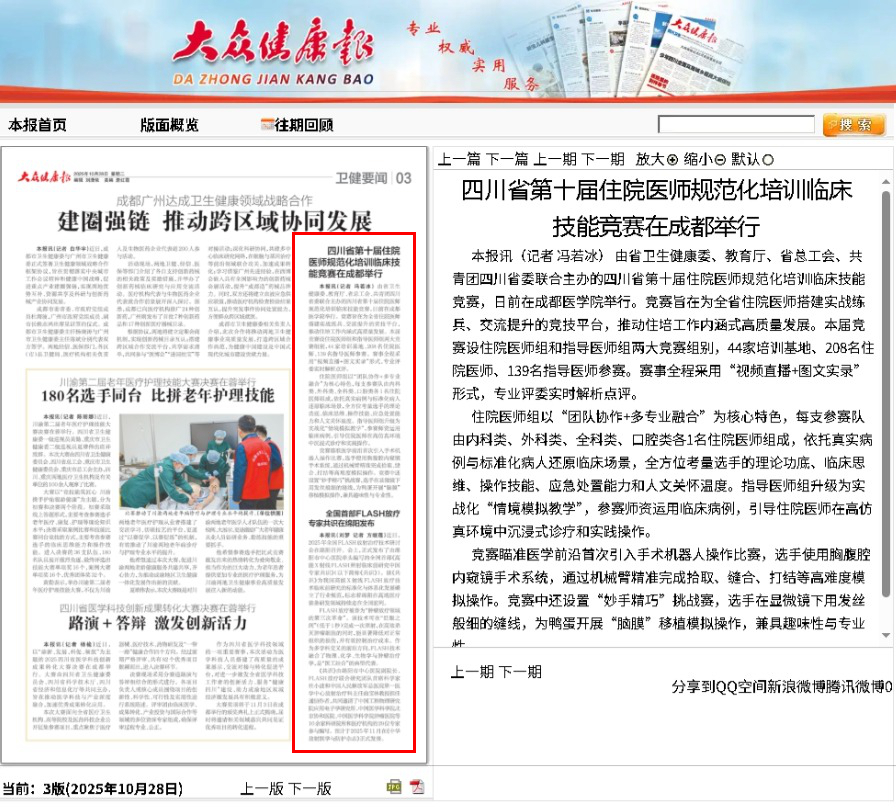 本报讯(记者 冯若冰) 由省卫生健康委、教育厅、省总工会、共青团四川省委联合主办的四川省第十届住院医师规范化培训临床技能竞赛,日前在成都医学院举行。竞赛旨在为全省住院医师搭建实战练兵、交流提升的竞技平台,推动住培工作内涵式高质量发展。本届竞赛设住院医师组和指导医师组两大竞赛组别,44家培训基地、208名住院医师、139名指导医师参赛。赛事全程采用“视频直播+图文实录”形式,专业评委实时解析点评。