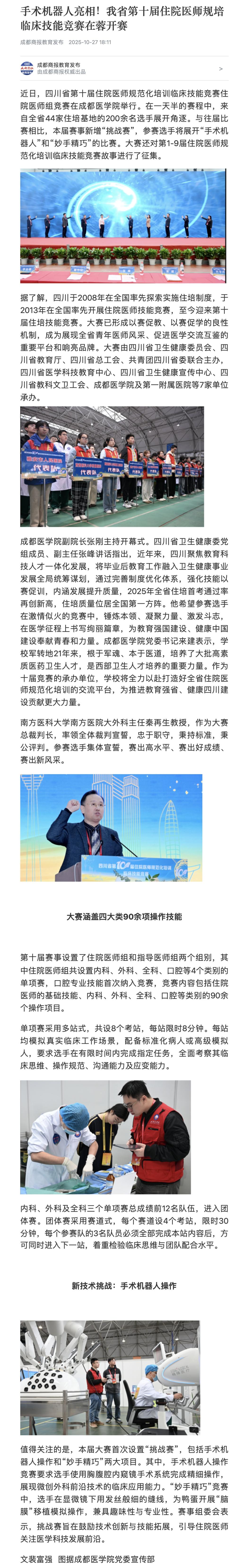 成都医学院副院长张刚主持开幕式。四川省卫生健康委党组成员、副主任张峰讲话指出,近年来,四川聚焦教育科技人才一体化发展,将毕业后教育工作融入卫生健康事业发展全局统筹谋划,通过完善制度优化体系,强化技能以赛促训,内涵发展提升质量,2025年全省住培首考通过率再创新高,住培质量位居全国第一方阵。他希望参赛选手在激情似火的竞赛中,锤炼本领、凝聚力量、激发斗志,在医学征程上书写绚丽篇章,为教育强国建设、健康中国建设奉献青春和力量。成都医学院党委书记来建表示,学校军转地21年来,根于军魂、本于医道,培养了大批高素质医药卫生人才,是西部卫生人才培养的重要力量。作为十届竞赛的承办单位,学校将全力以赴打造好全省住院医师规范化培训的交流平台,为推进教育强省、健康四川建设贡献更大力量。