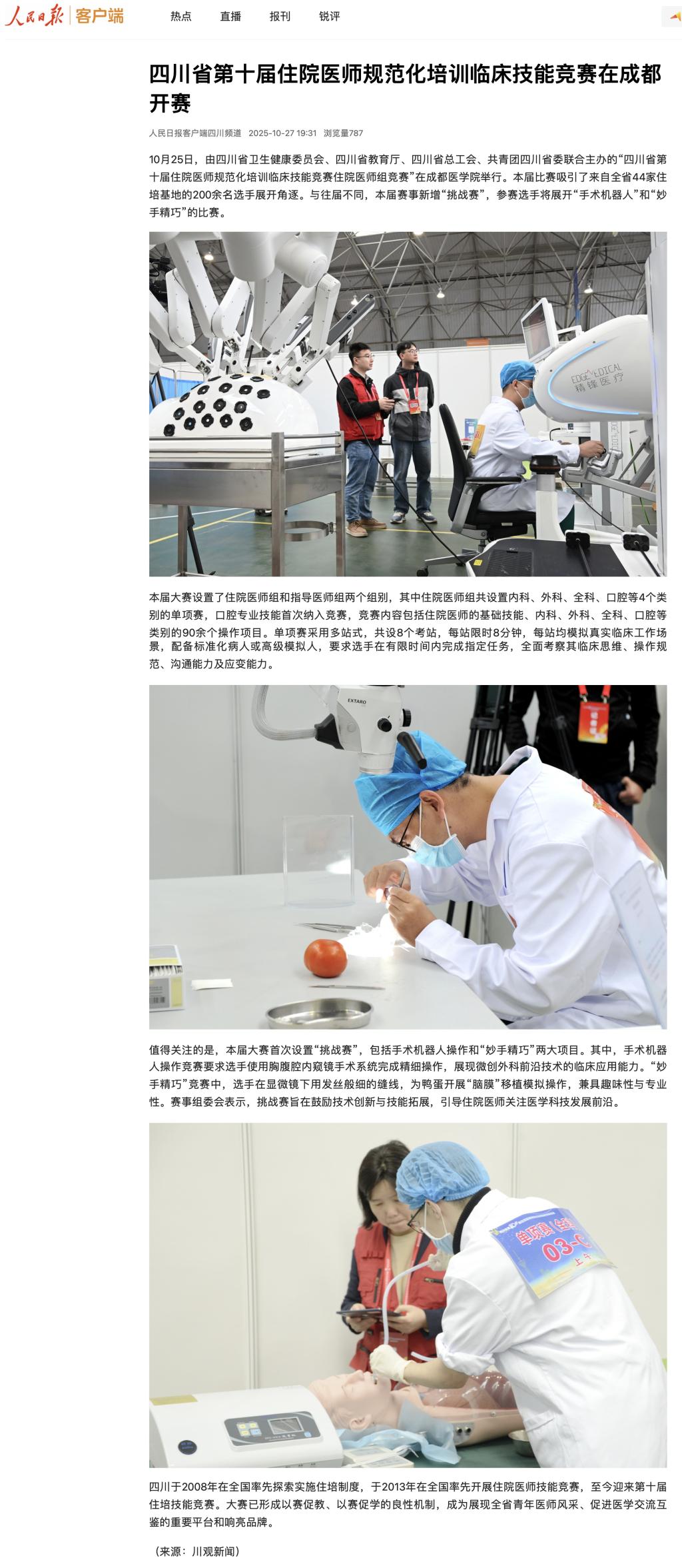 四川于2008年在全国率先探索实施住培制度,于2013年在全国率先开展住院医师技能竞赛,至今迎来第十届住培技能竞赛。大赛已形成以赛促教、以赛促学的良性机制,成为展现全省青年医师风采、促进医学交流互鉴的重要平台和响亮品牌。