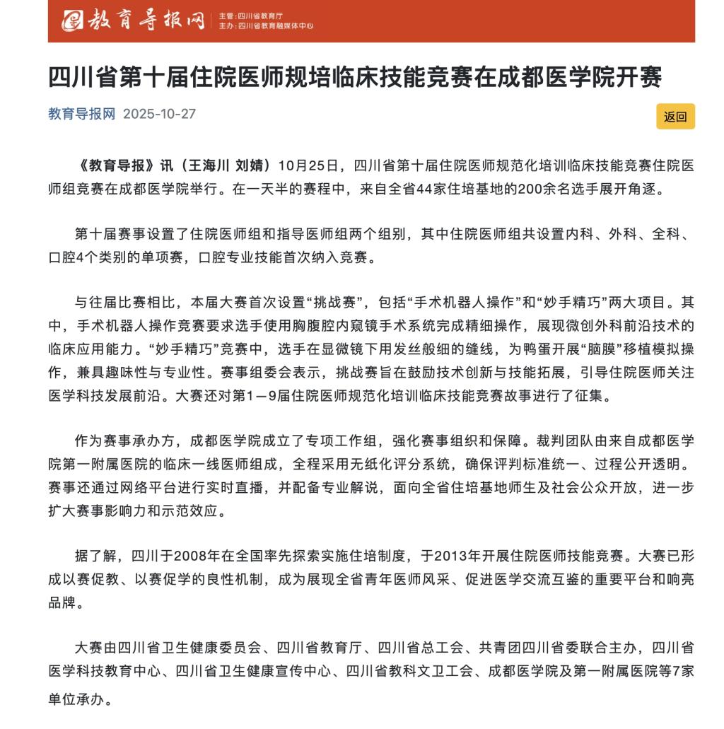 据了解,四川于2008年在全国率先探索实施住培制度,于2013年开展住院医师技能竞赛。大赛已形成以赛促教、以赛促学的良性机制,成为展现全省青年医师风采、促进医学交流互鉴的重要平台和响亮品牌。