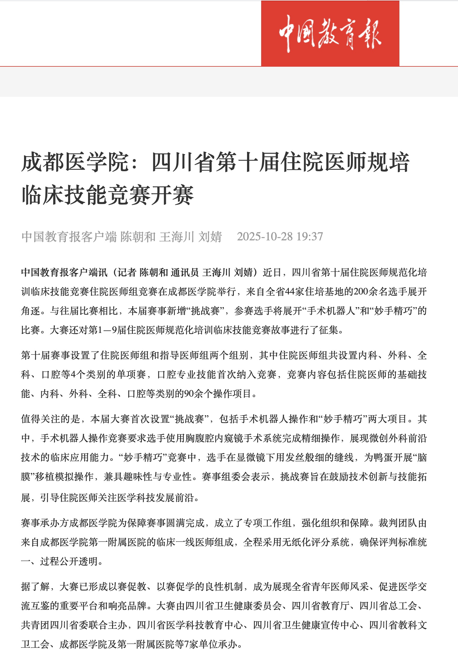 中国教育报客户端讯(记者 陈朝和 通讯员 王海川 刘婧)近日,四川省第十届住院医师规范化培训临床技能竞赛住院医师组竞赛在成都医学院举行,来自全省44家住培基地的200余名选手展开角逐。与往届比赛相比,本届赛事新增“挑战赛”,参赛选手将展开“手术机器人”和“妙手精巧”的比赛。大赛还对第1—9届住院医师规范化培训临床技能竞赛故事进行了征集。