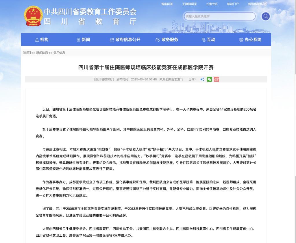 据了解,四川于2008年在全国率先探索实施住培制度,于2013年开展住院医师技能竞赛。大赛已形成以赛促教、以赛促学的良性机制,成为展现全省青年医师风采、促进医学交流互鉴的重要平台和响亮品牌。