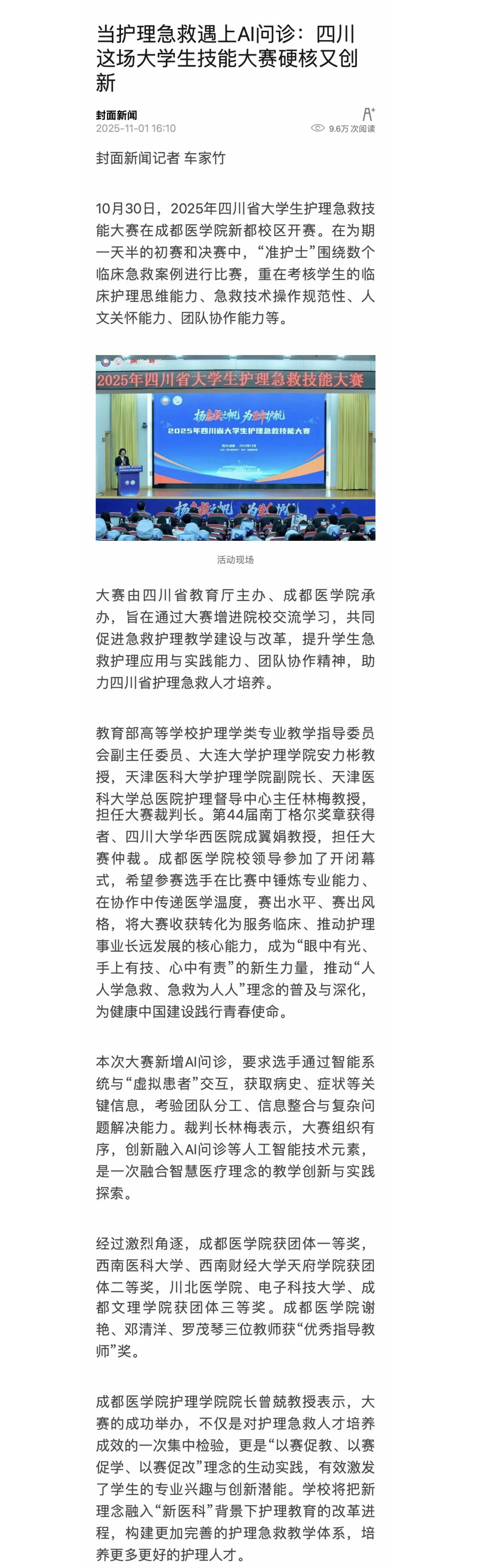 10月30日,2025年四川省大学生护理急救技能大赛在成都医学院新都校区开赛。在为期一天半的初赛和决赛中,“准护士”围绕数个临床急救案例进行比赛,重在考核学生的临床护理思维能力、急救技术操作规范性、人文关怀能力、团队协作能力等。