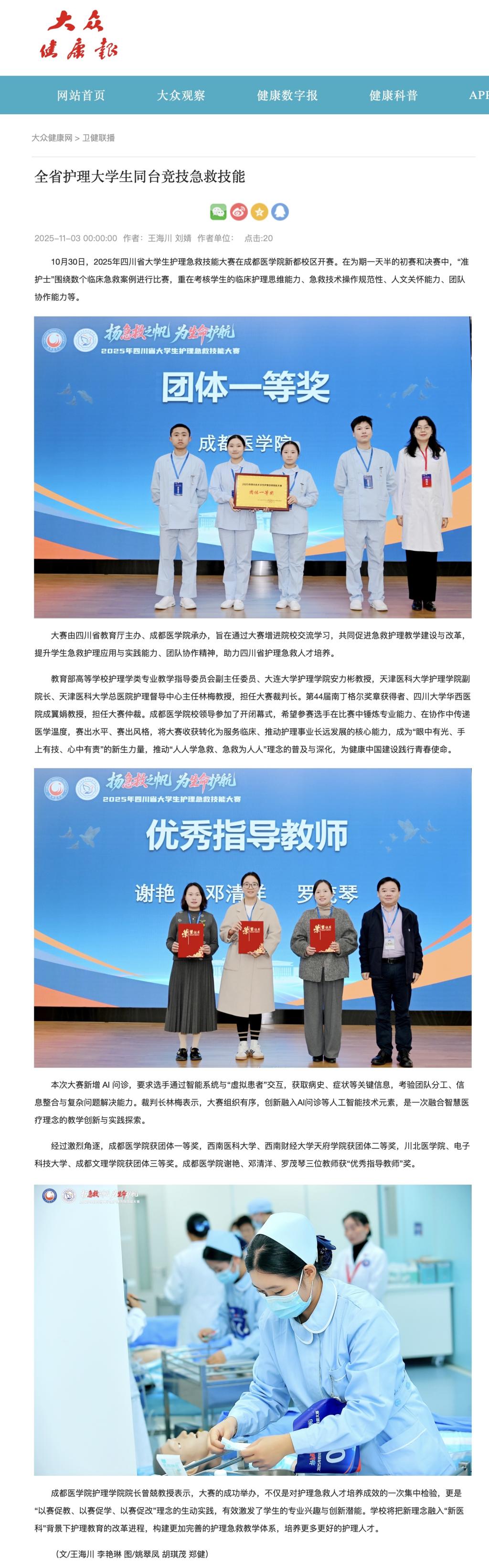 10月30日,2025年四川省大学生护理急救技能大赛在成都医学院新都校区开赛。在为期一天半的初赛和决赛中,“准护士”围绕数个临床急救案例进行比赛,重在考核学生的临床护理思维能力、急救技术操作规范性、人文关怀能力、团队协作能力等。