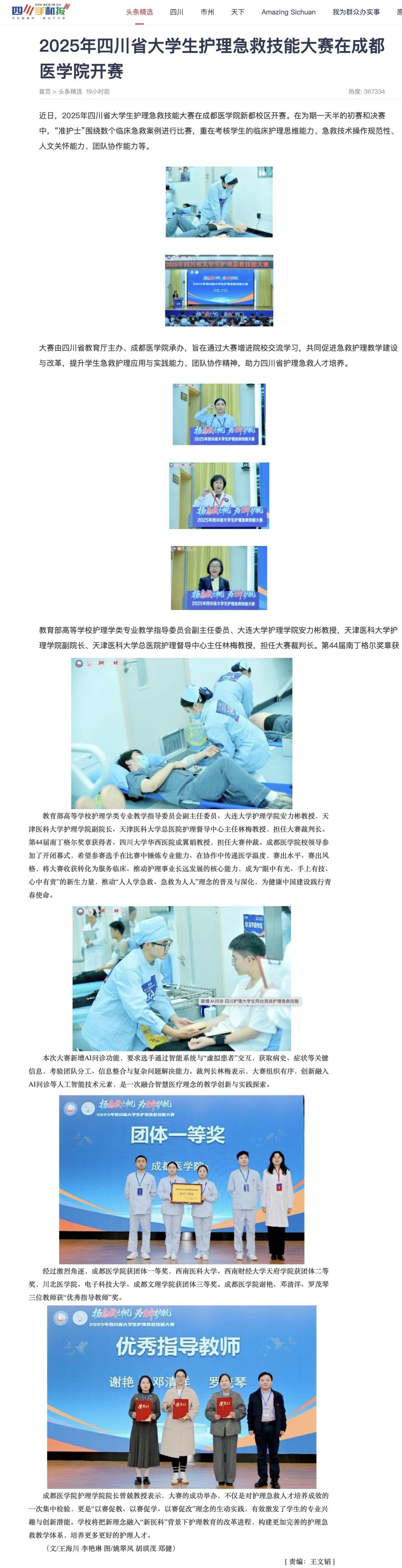 近日,2025年四川省大学生护理急救技能大赛在成都医学院新都校区开赛。在为期一天半的初赛和决赛中,“准护士”围绕数个临床急救案例进行比赛,重在考核学生的临床护理思维能力、急救技术操作规范性、人文关怀能力、团队协作能力等。