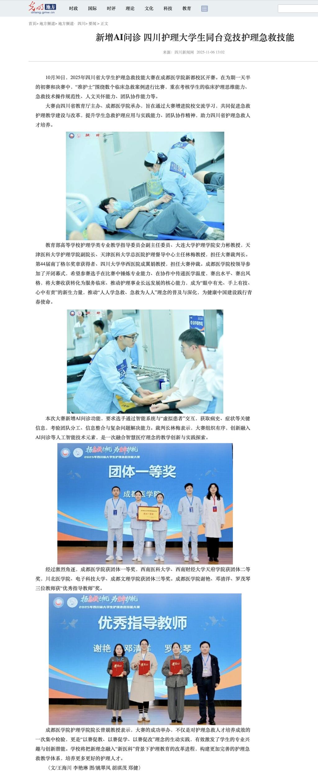 成都医学院护理学院院长曾兢教授表示,大赛的成功举办,不仅是对护理急救人才培养成效的一次集中检验,更是“以赛促教、以赛促学、以赛促改”理念的生动实践,有效激发了学生的专业兴趣与创新潜能。学校将把新理念融入“新医科”背景下护理教育的改革进程,构建更加完善的护理急救教学体系,培养更多更好的护理人才。