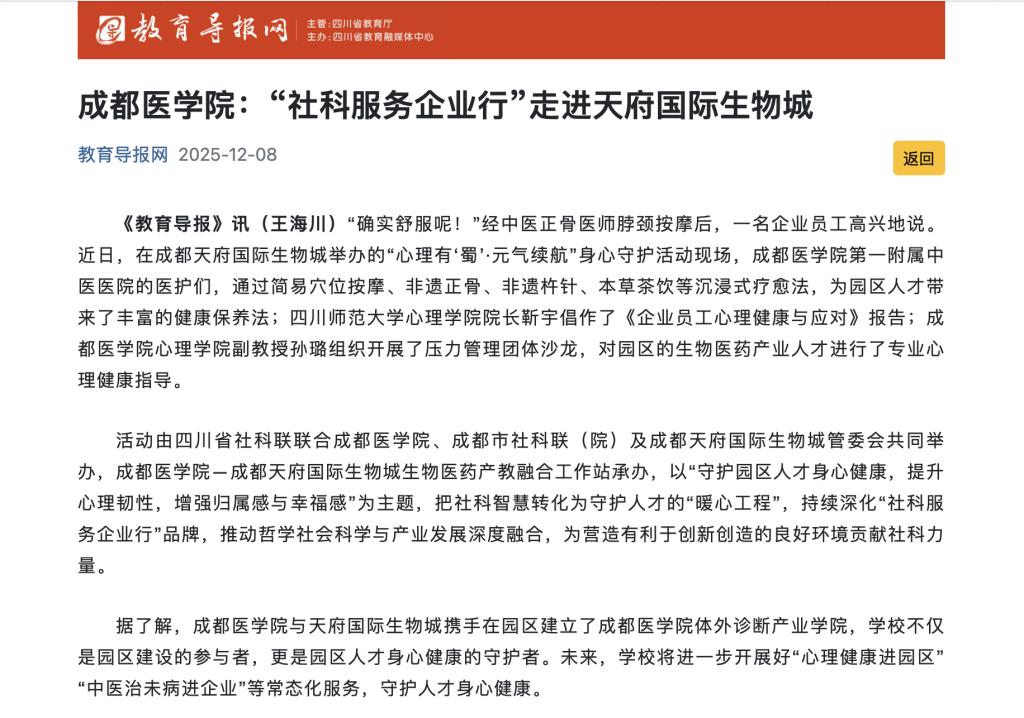 据了解,成都医学院与天府国际生物城携手在园区建立了成都医学院体外诊断产业学院,学校不仅是园区建设的参与者,更是园区人才身心健康的守护者。未来,学校将进一步开展好“心理健康进园区”“中医治未病进企业”等常态化服务,守护人才身心健康。
