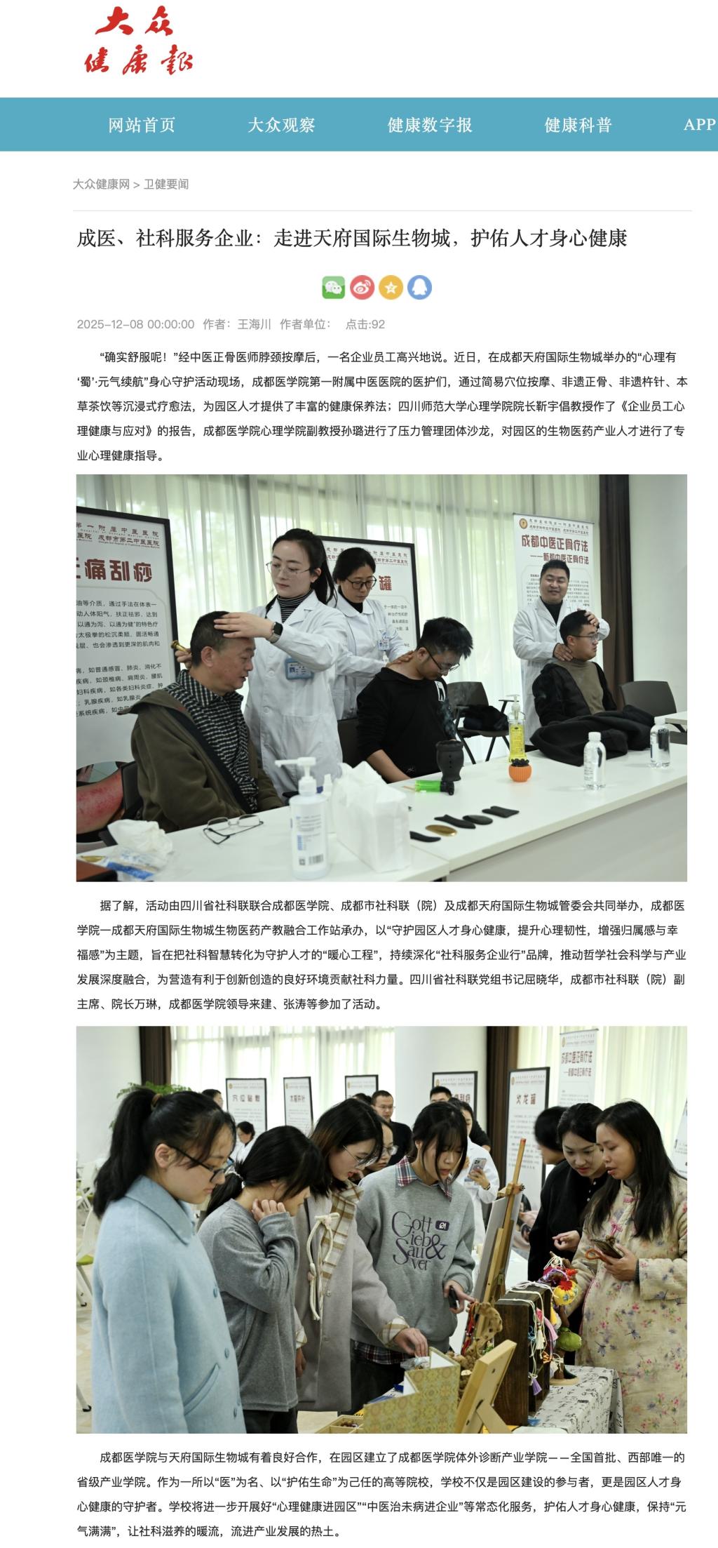 成都医学院与天府国际生物城有着良好合作,在园区建立了成都医学院体外诊断产业学院——全国首批、西部唯一的省级产业学院。作为一所以“医”为名、以“护佑生命”为己任的高等院校,学校不仅是园区建设的参与者,更是园区人才身心健康的守护者。学校将进一步开展好“心理健康进园区”“中医治未病进企业”等常态化服务,护佑人才身心健康,保持“元气满满”,让社科滋养的暖流,流进产业发展的热土。