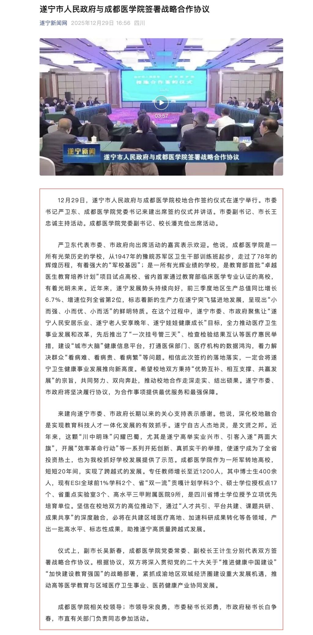 遂宁新闻网微信公众号:遂宁市人民政府与成都医学院签署战略合作协议