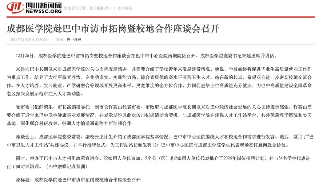 原标题:成都医学院赴巴中市访市拓岗暨校地合作座谈会召开