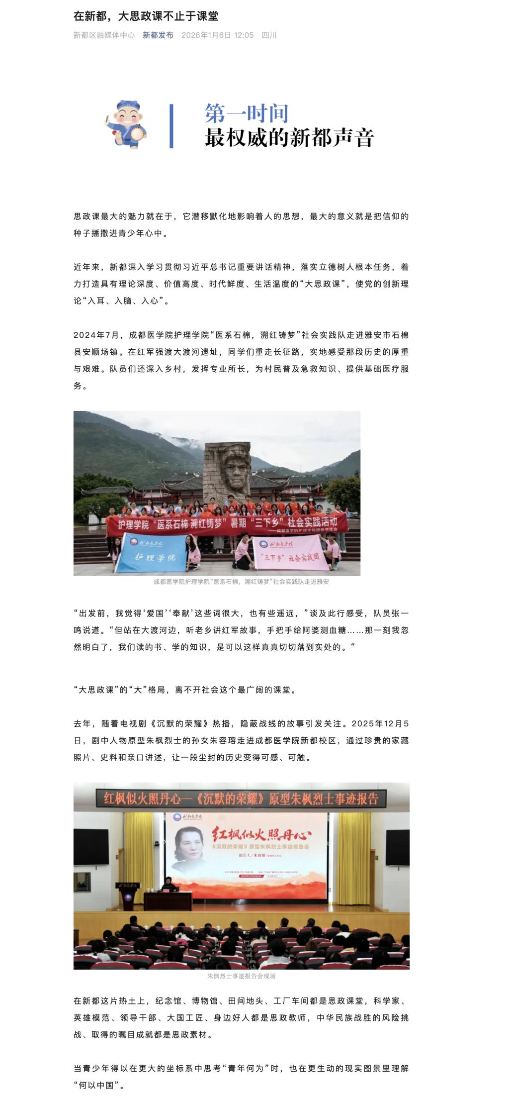 在新都这片热土上,纪念馆、博物馆、田间地头、工厂车间都是思政课堂,科学家、英雄模范、领导干部、大国工匠、身边好人都是思政教师,中华民族战胜的风险挑战、取得的瞩目成就都是思政素材。