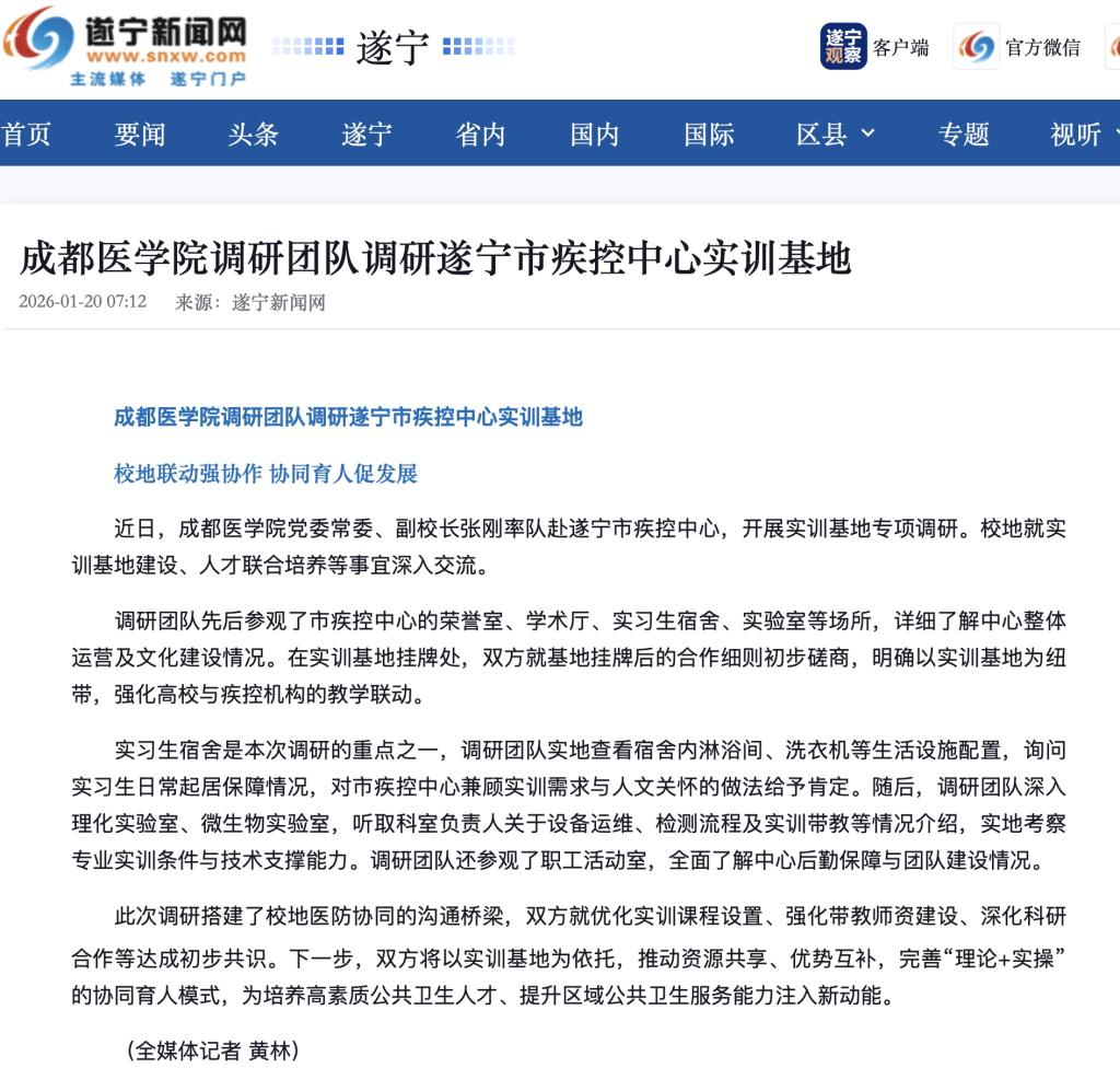 近日,成都医学院党委常委、副校长张刚率队赴遂宁市疾控中心,开展实训基地专项调研。校地就实训基地建设、人才联合培养等事宜深入交流。