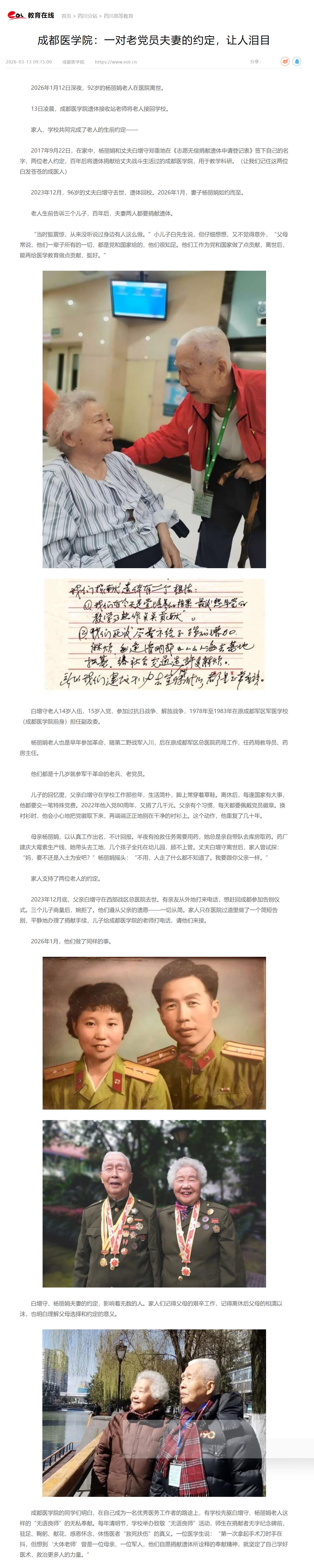 2017年9月22日,在家中,杨丽娟和丈夫白增守郑重地在《志愿无偿捐献遗体申请登记表》签下自己的名字,两位老人约定,百年后将遗体捐献给丈夫战斗生活过的成都医学院,用于教学科研。(让我们记住这两位白发苍苍的成医人)