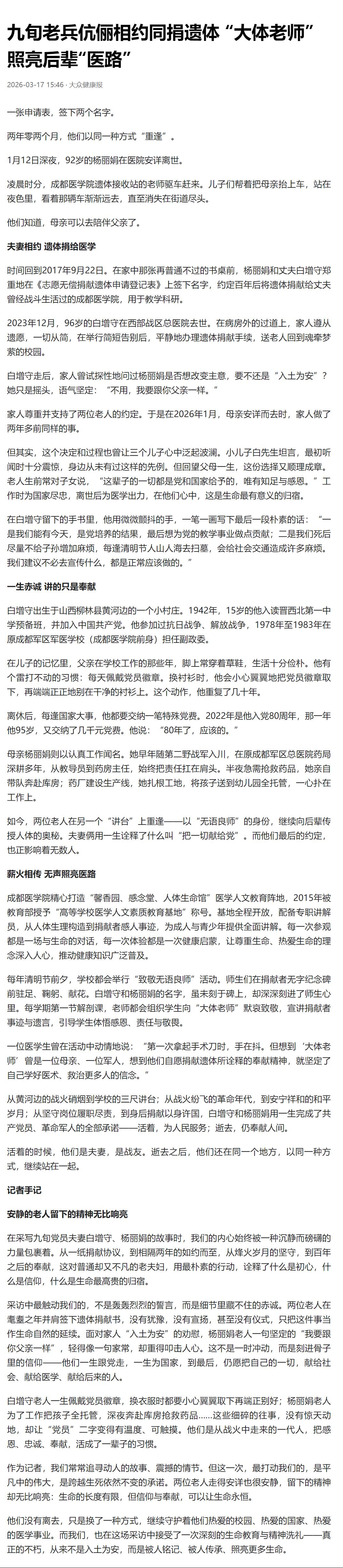 在采写九旬党员夫妻白增守、杨丽娟的故事时,我们的内心始终被一种沉静而磅礴的力量包裹着。从一纸捐献协议,到相隔两年的如约而至,从烽火岁月的坚守,到百年之后的奉献,这对普通却又不凡的老夫妇,用最朴素的行动,诠释了什么是初心,什么是信仰,什么是生命最高贵的归宿。