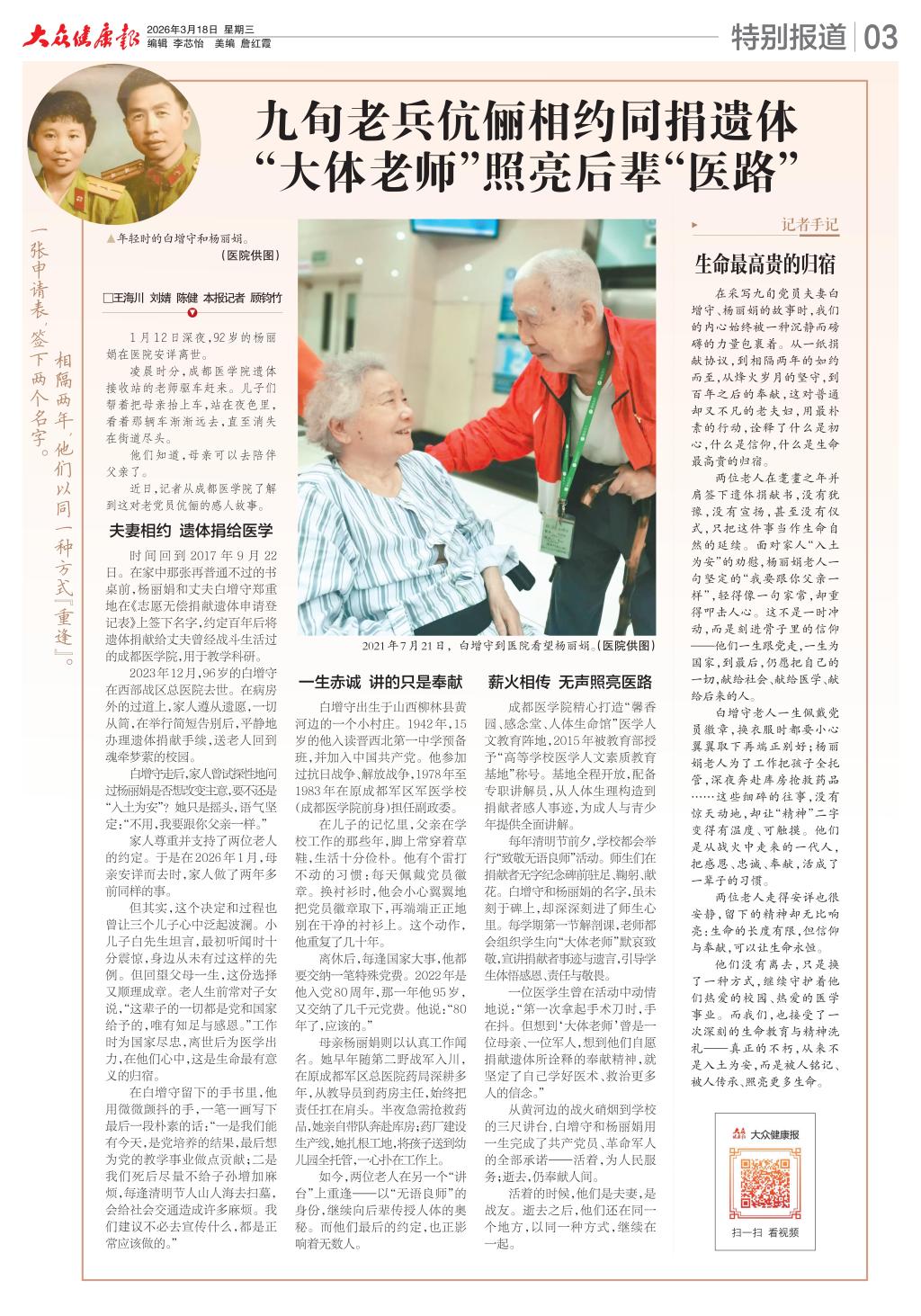 在采写九旬党员夫妻白增守、杨丽娟的故事时,我们的内心始终被一种沉静而磅礴的力量包裹着。从一纸捐献协议,到相隔两年的如约而至,从烽火岁月的坚守,到百年之后的奉献,这对普通却又不凡的老夫妇,用最朴素的行动,诠释了什么是初心,什么是信仰,什么是生命最高贵的归宿。