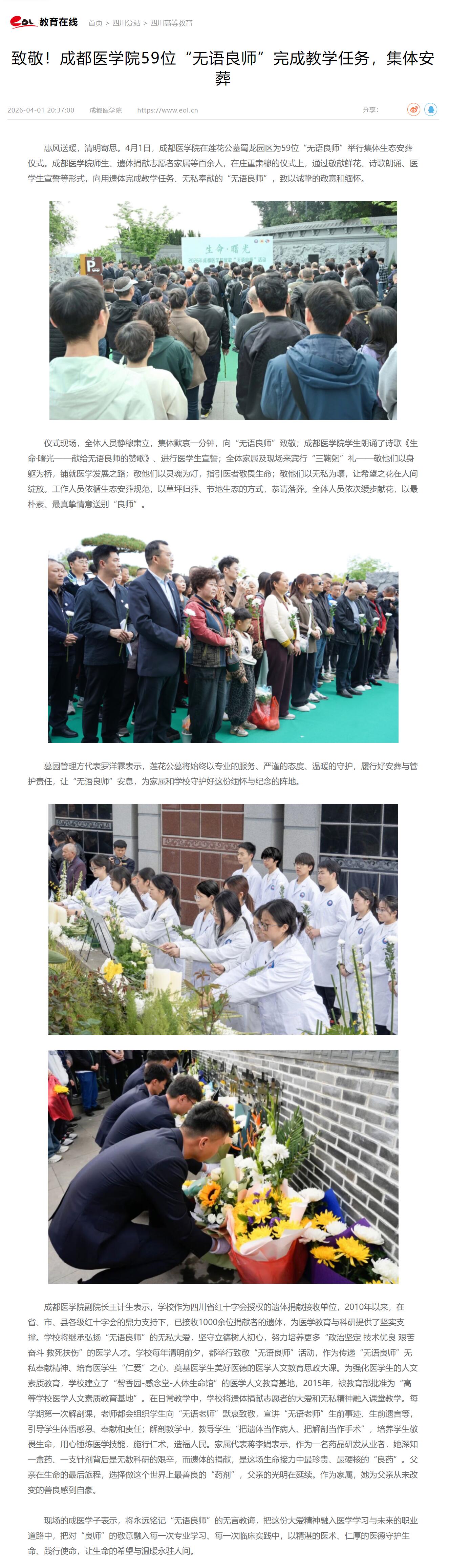 惠风送暖,清明寄思。4月1日,成都医学院在莲花公墓蜀龙园区为59位“无语良师”举行集体生态安葬仪式。成都医学院师生、遗体捐献志愿者家属等百余人,在庄重肃穆的仪式上,通过敬献鲜花、诗歌朗诵、医学生宣誓等形式,向用遗体完成教学任务、无私奉献的“无语良师”,致以诚挚的敬意和缅怀。