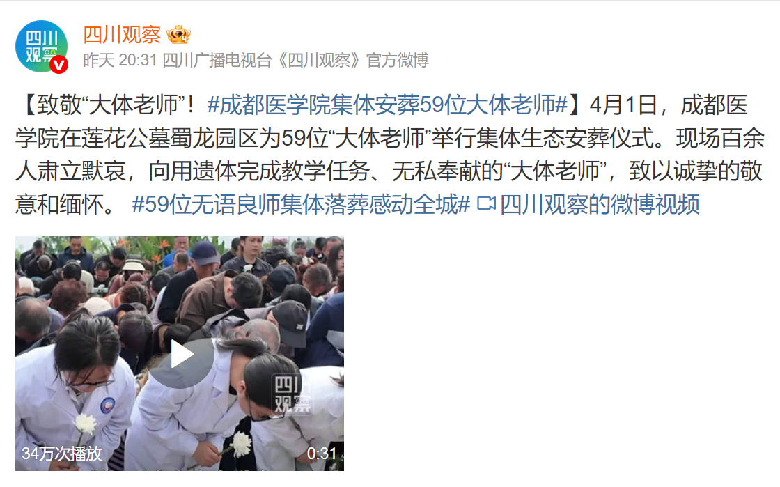 【致敬“大体老师”!#成都医学院集体安葬59位大体老师#】4月1日,成都医学院在莲花公墓蜀龙园区为59位“大体老师”举行集体生态安葬仪式。现场百余人肃立默哀,向用遗体完成教学任务、无私奉献的“大体老师”,致以诚挚的敬意和缅怀。#59位无语良师集体落葬感动全城#四川观察的微博视频
