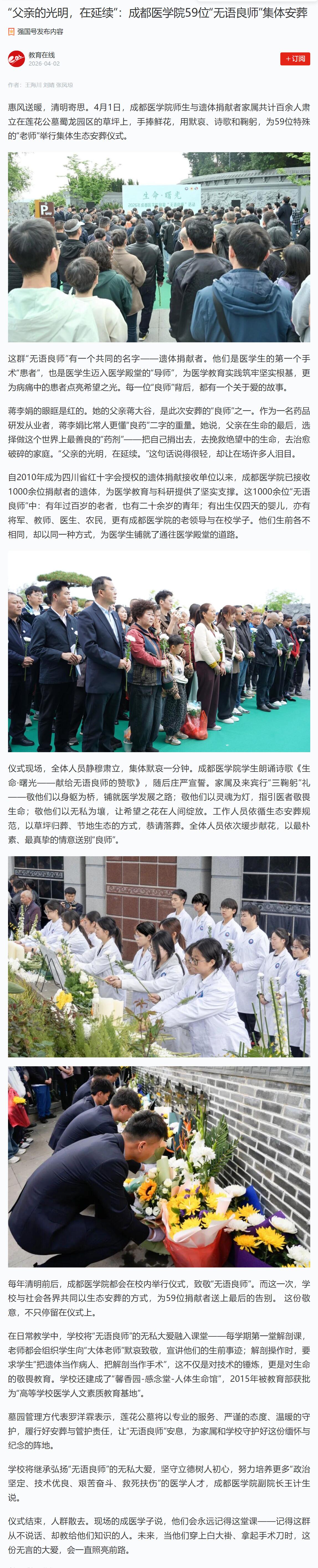 仪式结束,人群散去。现场的成医学子说,他们会永远记得这堂课——记得这群从不说话、却教给他们知识的人。未来,当他们穿上白大褂、拿起手术刀时,这份无言的大爱,会一直照亮前路。
