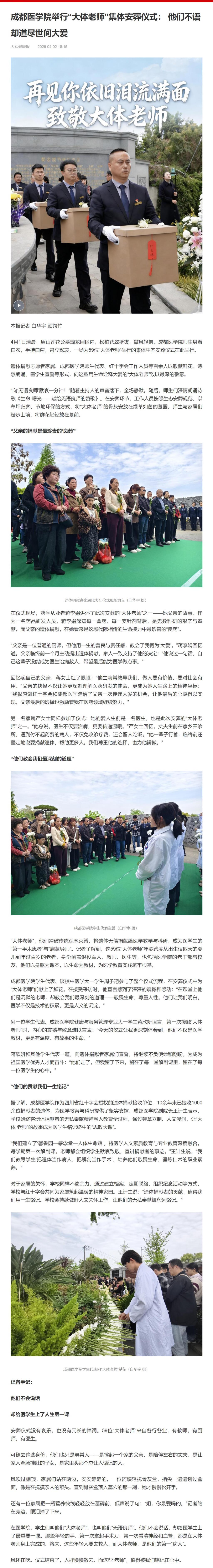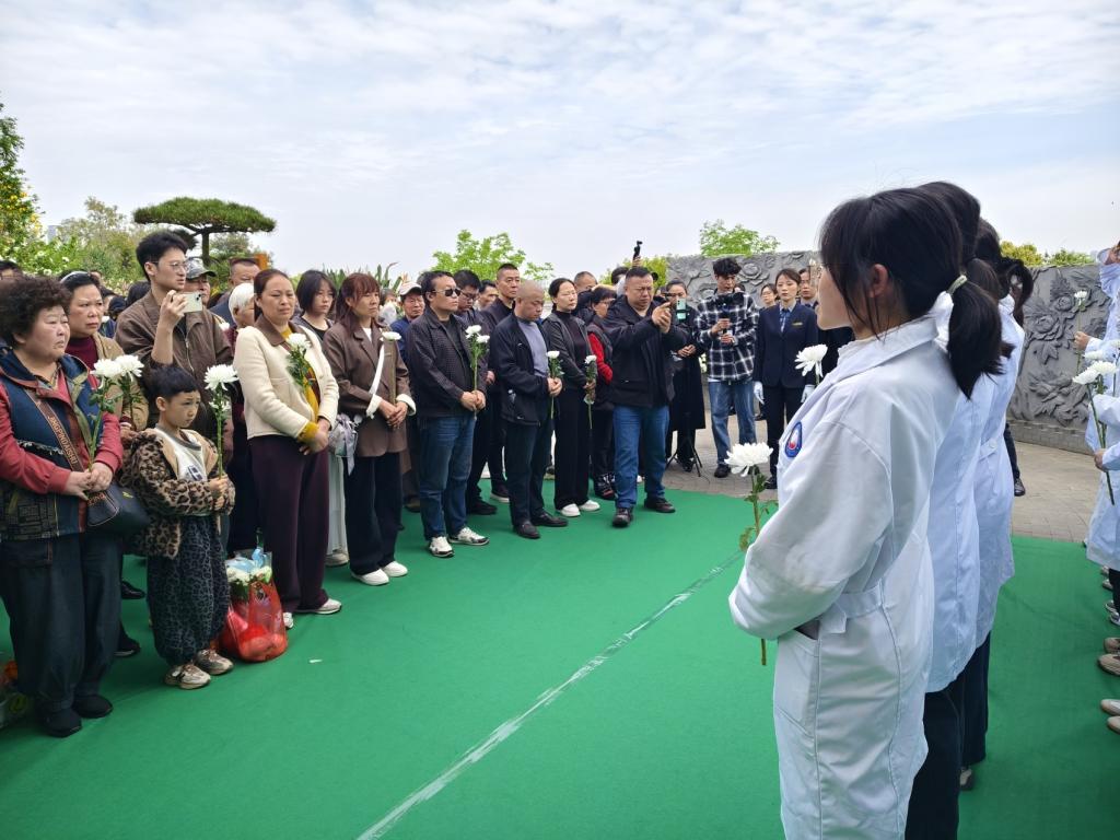 4月1日清晨,眉山莲花公墓蜀龙园区内,松柏苍翠挺拔,微风轻拂。成都医学院师生身着白衣,手持白菊,肃立默哀,一场为59位“大体老师”举行的集体生态安葬仪式在此举行。