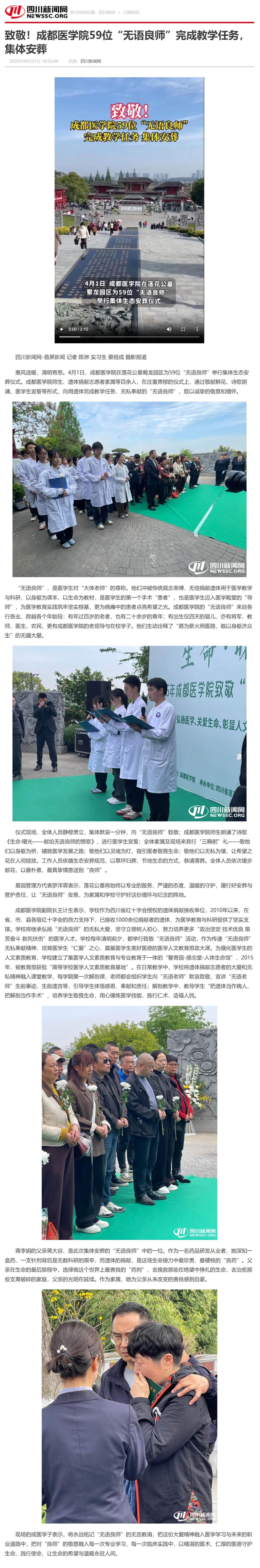 成都医学院副院长王计生表示,学校作为四川省红十字会授权的遗体捐献接收单位,2010年以来,在省、市、县各级红十字会的鼎力支持下,已接收1000余位捐献者的遗体,为医学教育与科研提供了坚实支撑。学校将继承弘扬“无语良师”的无私大爱,坚守立德树人初心,努力培养更多“政治坚定 技术优良 艰苦奋斗 救死扶伤”的医学人才。学校每年清明前夕,都举行致敬“无语良师”活动,作为传递“无语良师”无私奉献精神、培育医学生“仁爱”之心、奠基医学生美好医德的医学人文教育思政大课。为强化医学生的人文素质教育,学校建立了集医学人文素质教育与专业教育于一体的“馨香园-感念堂-人体生命馆”,2015年,被教育部获批“高等学校医学人文素质教育基地”。在日常教学中,学校将遗体捐献志愿者的大爱和无私精神融入课堂教学,每学期第一次解剖课,老师都会组织学生向“无语老师”默哀致敬,宣讲“无语老师”生前事迹、生前遗言等,引导学生体悟感恩、奉献和责任;解剖教学中,教导学生“把遗体当作病人、把解剖当作手术”,培养学生敬畏生命,用心锤炼医学技能,施行仁术,造福人民。