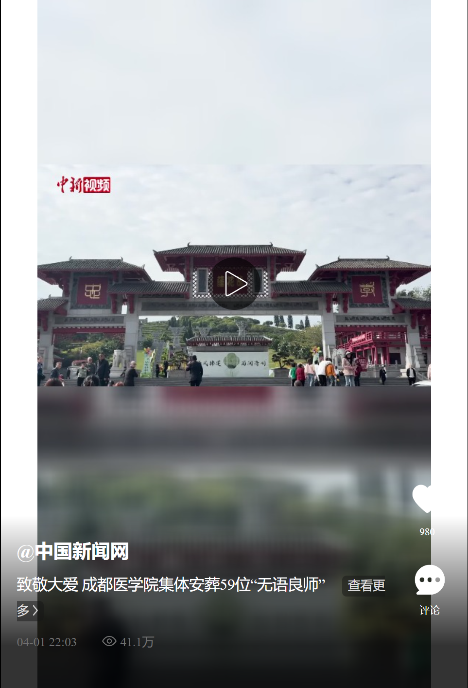 4月1日,成都医学院“无语良师”骨灰集体安葬及致敬仪式在成都天府新区莲花公墓举行,59位无偿捐献遗体用于医学教育的“无语良师”(医学生对“大体老师”的尊称)在此安息。百余名师生代表、捐献者家属齐聚现场,以默哀、献花、诗歌朗诵等形式,缅怀这份跨越生死的无私奉献。