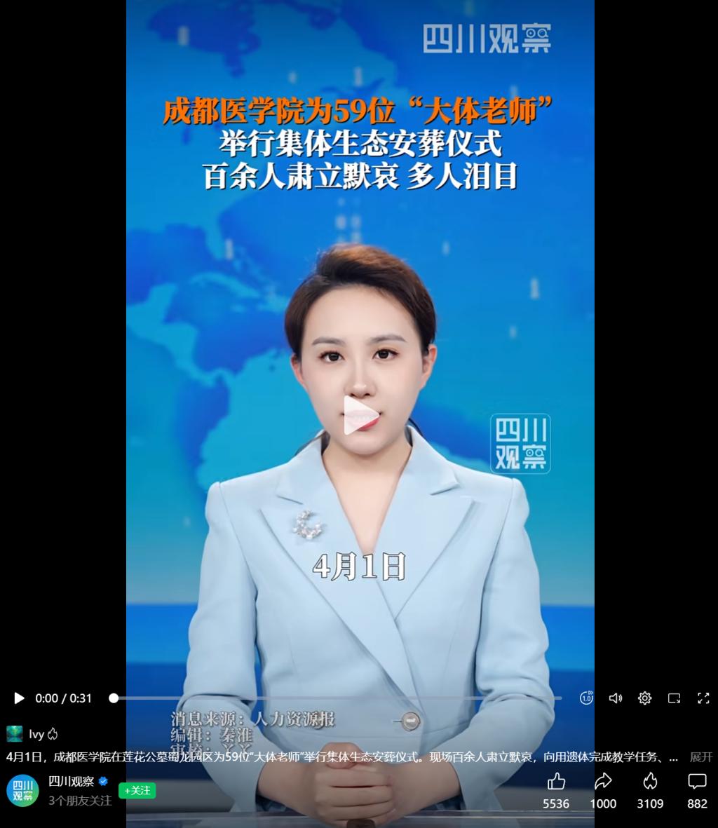 上一条:九派新闻微信视频号:4月1日,四川成都,59位大体老师集体安葬,39岁教师临终选择捐献遗体,家属:我同意了,因为我是人民警察,我和妻子也想捐献遗体,和儿子一路。 下一条:新华每日电讯:成都医学院为“大体老师”举行集体安葬仪式,致敬以身躯为医学生引路的“无语良师”们。传递薪火,大爱无疆!
