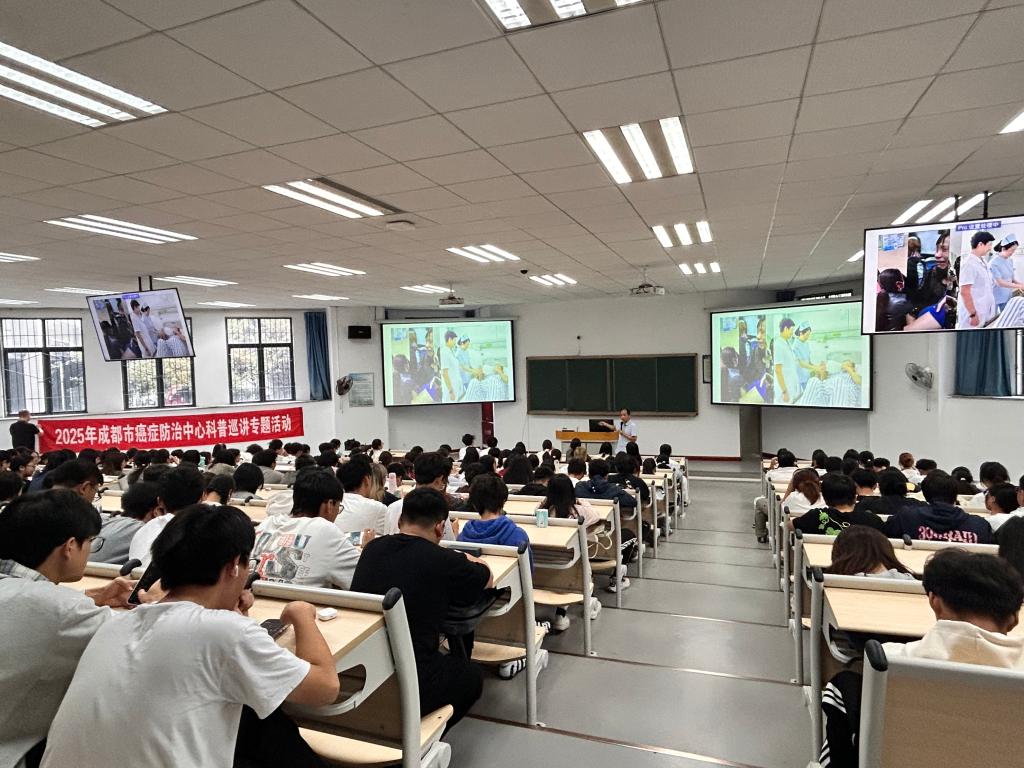 在第二环节“科学预防癌症知识普及”中,成都市第一人民医院肿瘤科李争光主任医师从“可干预的癌症风险因素”入手,用翔实数据清晰阐释了吸烟、酗酒、不良饮食习惯、缺乏运动、长期熬夜等生活方式与癌症发病的密切关联。结合护理专业特点,李争光重点强调了癌症早期筛查的重要意义,系统介绍了肺癌、乳腺癌、结直肠癌等常见肿瘤的筛查方案与建议,鼓励同学们不仅要在日常生活中树立防癌意识,更要在未来临床工作中积极引导患者重视早筛早诊。