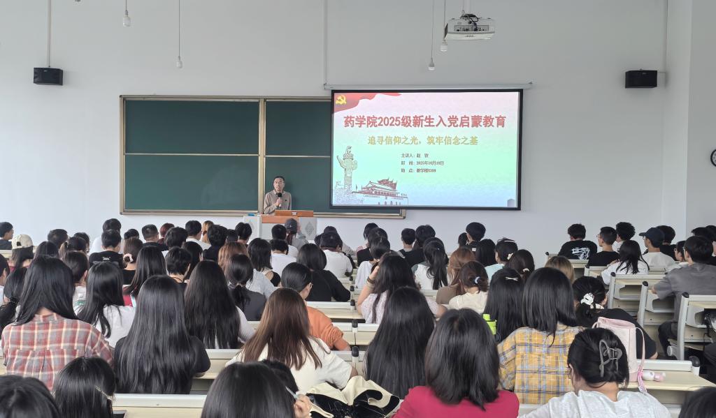 为进一步加强2025级新生对党的认识,深入贯彻落实立德树人根本任务,扎实做好大学生思想政治教育工作,引导2025级新生端正入党动机、明晰入党要求,扣好大学成长的“第一粒扣子”,10月10日,药学院党委组织开展2025级新生入党启蒙教育。学院领导、专职组织员、新生辅导员和2025级全体新生参加入党启蒙教育。