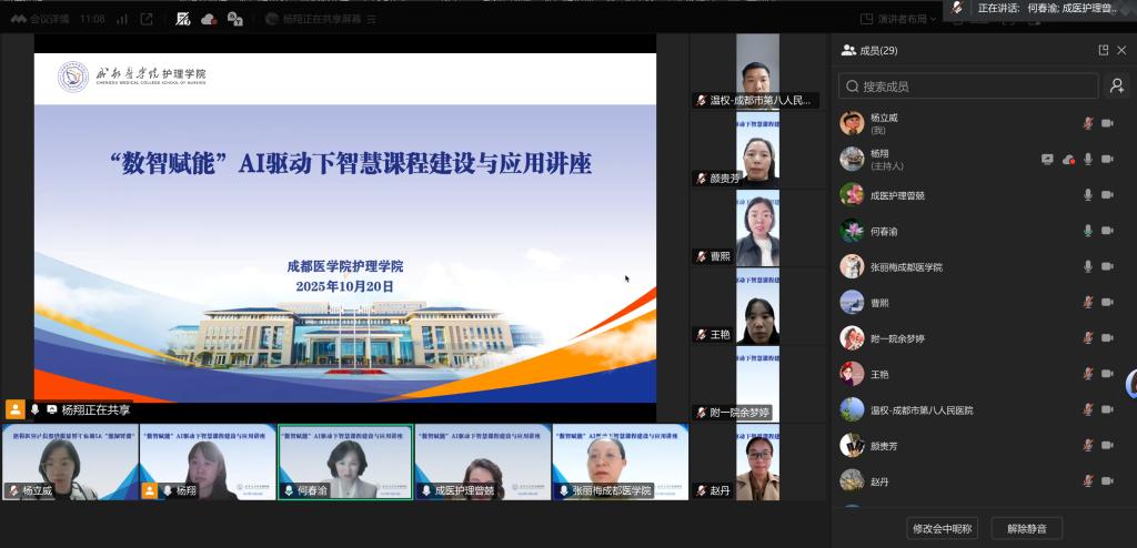 近日,为加快推进课程数智化建设,提升教师数字素养,护理学院于线上举办“‘数智赋能’AI驱动下智慧课程建设与应用”主题培训。本次培训特邀智慧树网高等教育研究院研究员何琪阳担任主讲,护理学院相关领导、教师、临床护理师资及老年康养课程群虚拟教研室成员共同参与。
