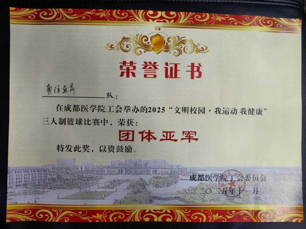近日,生物科学与技术学院“勇往直前”篮球队获成都医学院工会2025年文明校园·“我运动 我健康”三人制篮球比赛亚军。